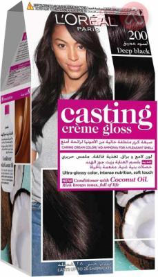 Loreal Casting Creme Gloss 200 Deep Black | 48Ml Product Description: • Ammonia-free hair dye that delivers natural color with a rich, glossy shine. • Provides intense hydration during coloring and covers gray hair up to 70%. It lasts more than 28 washes. How to use L'Oreal Casting No. 200 Dark Black: 1- Quick preparation of the dye: Color Cream Tube: Uncap the ammonia-free color cream tube. Remove the gray ring. Close the lid. Color Appearance Cream: Remove the tip of the color developer cream vial. Add the entire contents of the colored cream tube to the developer cream vial. Close the cream vial tightly. Shake the vial well to obtain a homogeneous mixture. Remove the top of the vial immediately after mixing its contents to avoid explosion or any damage that may result from leakage of the preparation.