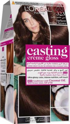 Loreal Casting Cream Gloss 323 Darkest Warm Brown |72Ml Product Description: Ammonia-free formula. An ultra-shiny, radiant effect with maximum gray coverage. Natural color that lasts up to 28 washes. Formulated to smooth hair. It helps protect the hair fiber, inside and out, and gives it exceptional softness, a stunning look, and a captivating shine. Helps protect the hair fiber. Makes your hair silky, soft, and manageable. Helps protect the hair fiber.