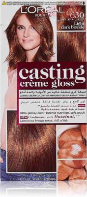 Loreal Casting Creme Gloss 630 Light Dark Blond | 72Ml Product Description: Ammonia-free hair dyes that deliver natural-looking hair color with bold, glossy shades that last up to 28 shampoos. The cream formula is fortified with a patented conditioning complex that helps protect the hair fiber from the inside out. The conditioner is enriched with royal jelly, which makes the hair look vibrant and adds exceptional softness and a clear shine to the hair.