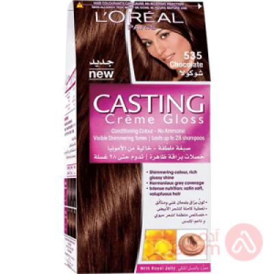 L'Oreal Casting Dye number · 535 Dye color · Chocolate (light golden brown) Instructions for use · Put on the gloves included in the package and mix the look and color in a non-metallic bowl in a 1:1 ratio. · We start from the roots to the ends, dividing the hair into sections. · Leave the dye for 25:30 minutes. · Rinse with water. · Apply conditioner and then rinse with water. Product Features · It has a lustrous color with a rich and radiant sheen. · Ammonia-free soothing dye. · It has soothing properties for lively and smooth hair. · Helps the wisps appear brightly. · Lasts up to 28 washes. · Provides complete coverage of white hair. How to maintain the color of the dye · Avoid direct exposure of dyed hair to sunlight. · Avoid exposure of dyed hair to dust.